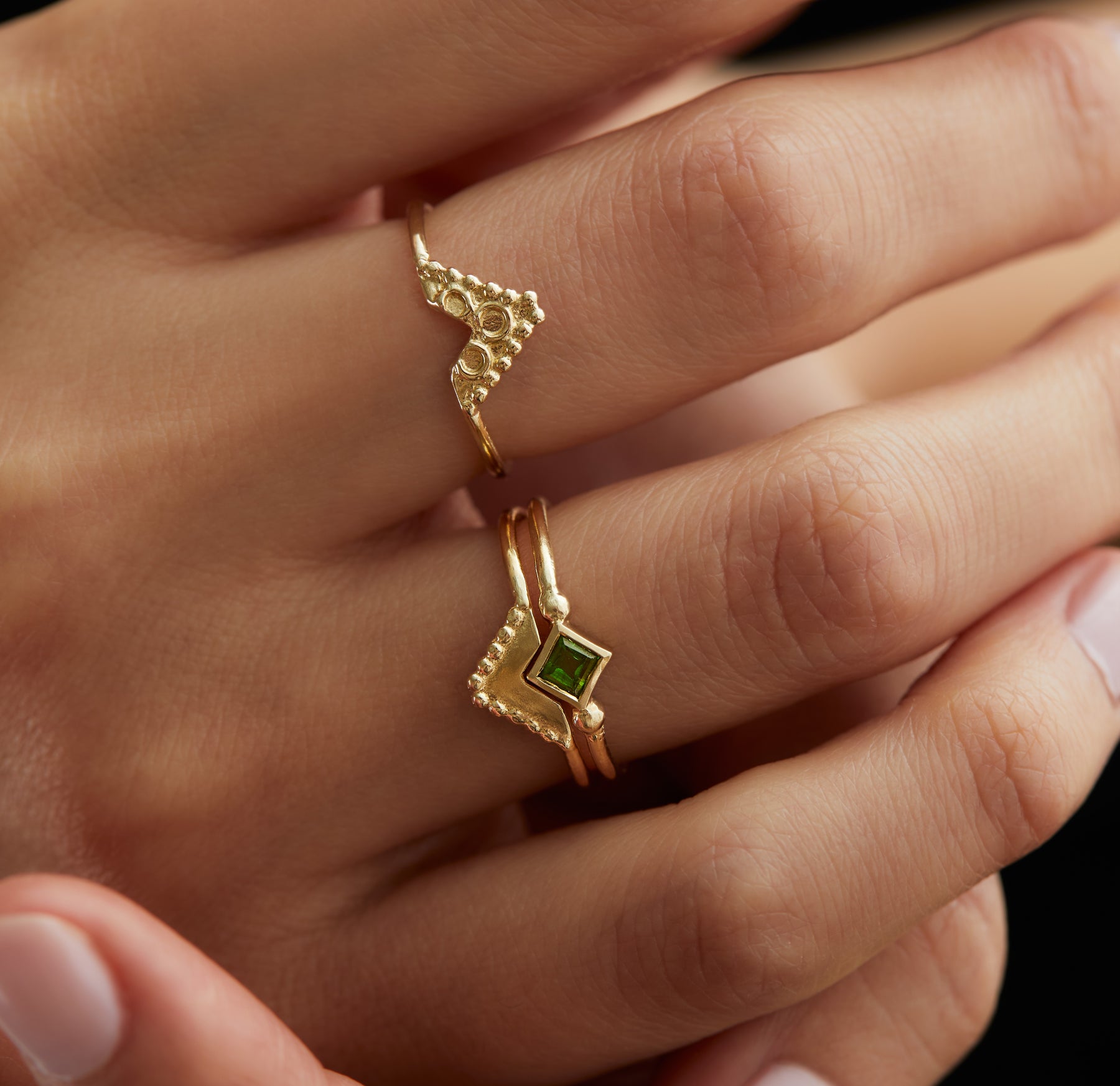מחיר 1,100.00 ₪ מחיר מבצע 990.00 ₪טבעת זהב בצורת משולש מעוטרת עיגולי זהב,