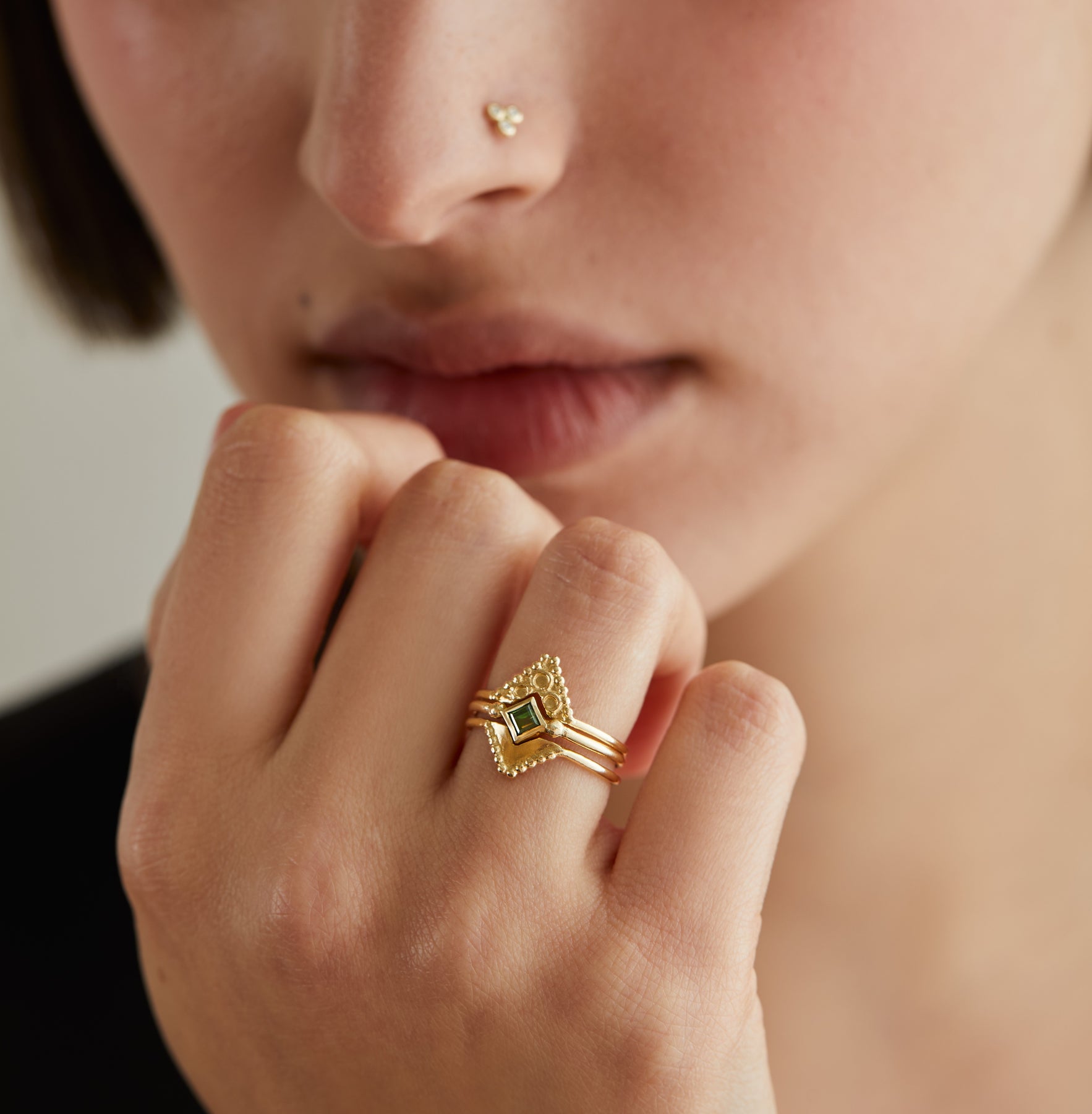 הטבעת יכולה להיענד לבד או בשילוב טבעת אבן מרובעת כסט (ראי תמונה(