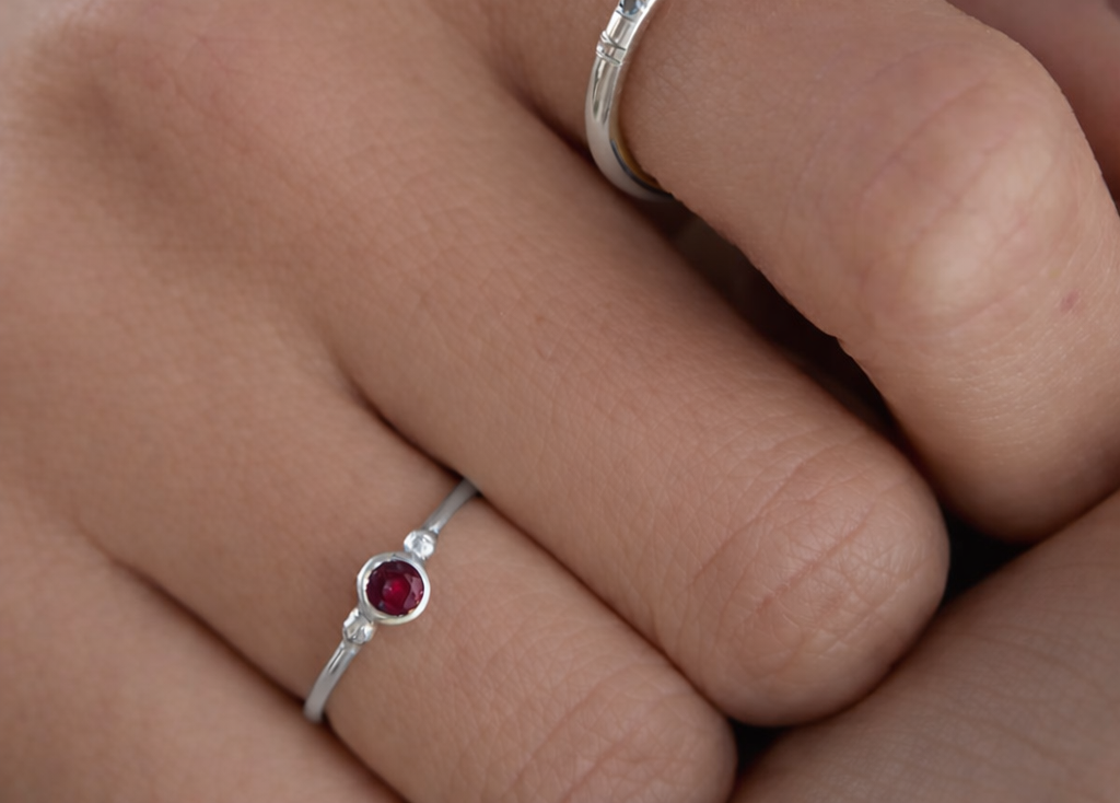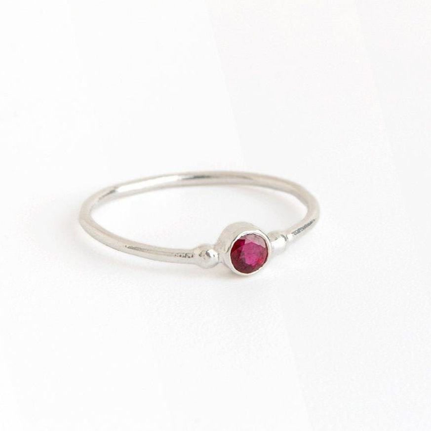 טבעת כסף סטרלינג עדינה משובצת אבן רובי עגולה.