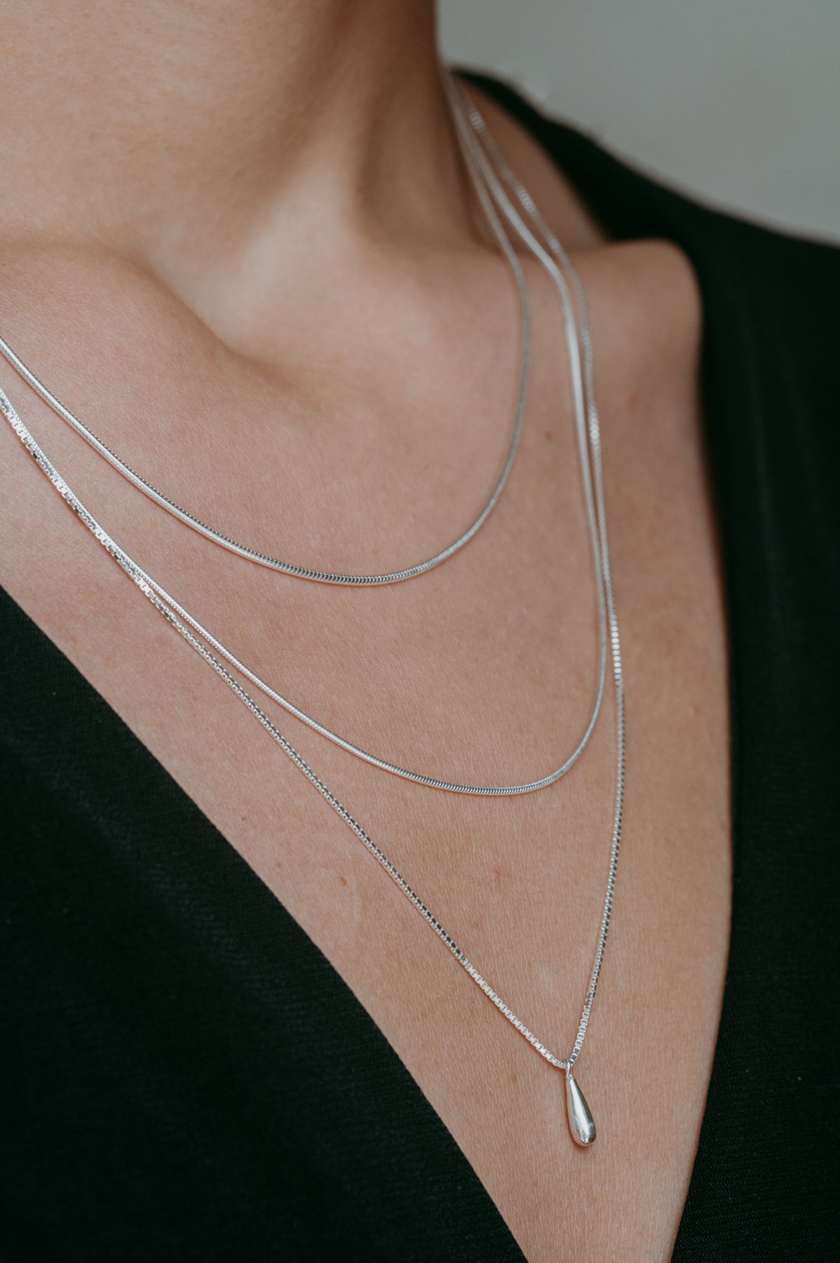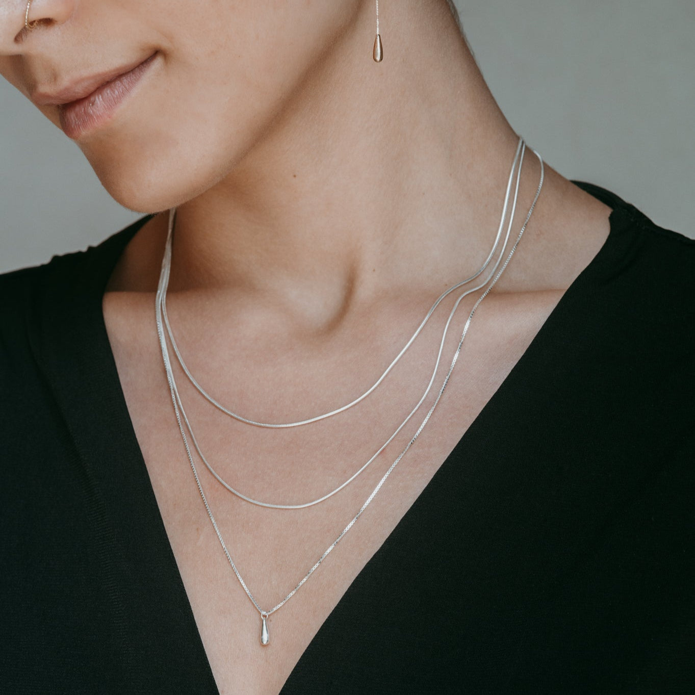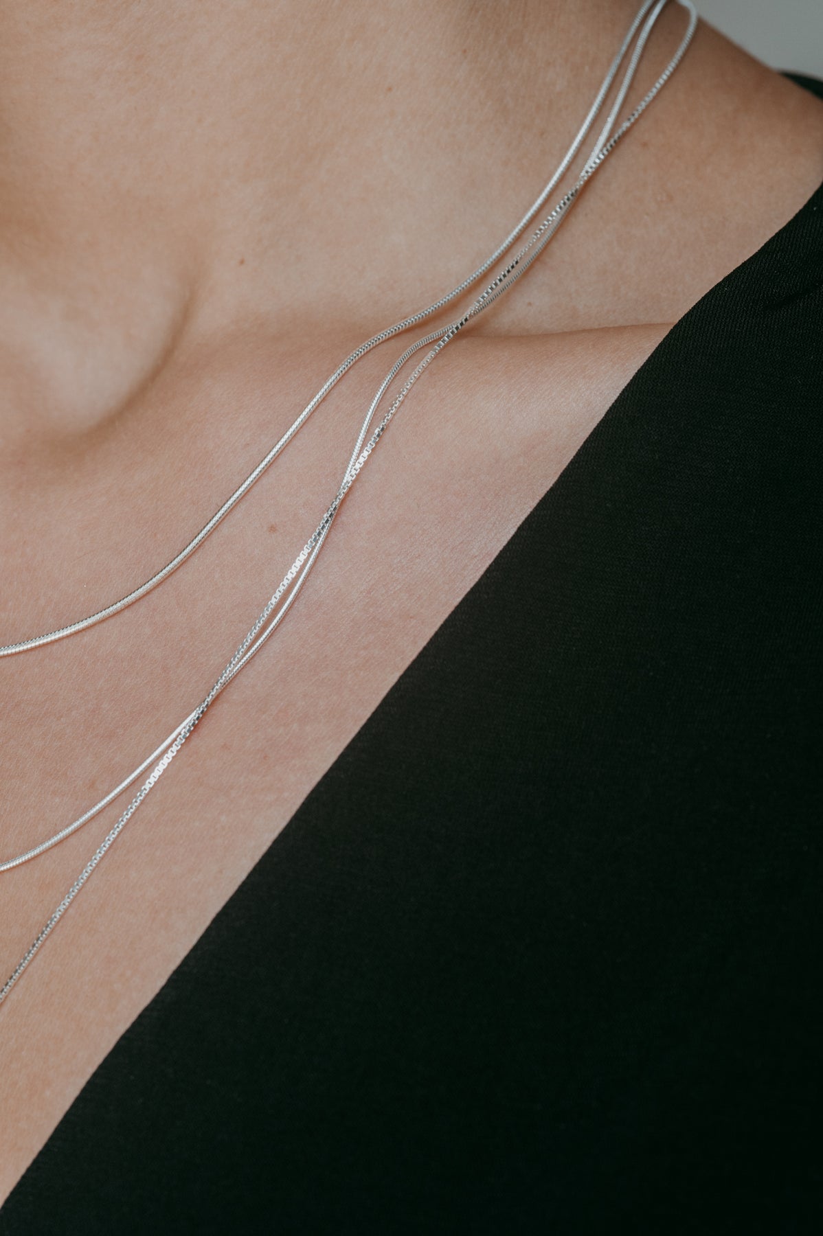 הדוגמנית עונדת את השרשרת סלין דקה באורך 50 ס"מ (השרשרת האמצעית בתמונה)